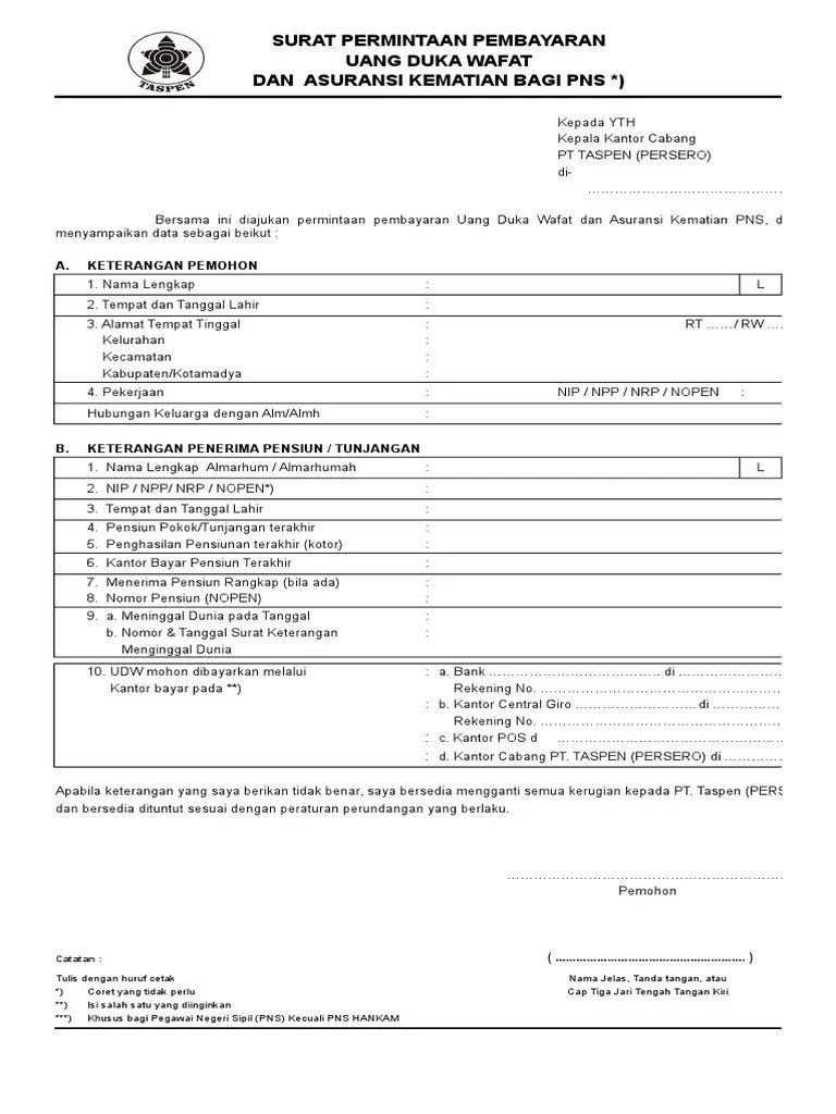 Pt taspen telah menerbitkan buku petunjuk teknis juknis pengoperasian aplikasi pengajuan klim. Pengajuan taspen (pensiun pertama sendiri). Berkas permohonan hak diajukan secara langsung oleh yan1.g bersangkutan atau melalui pos ke. Merupakan pemberian santunan dari pemerintah kepada keluarga/ahli waris penerima pensiun untuk meringankan beban keluarga yang ditinggalkan . Uang duka wafat 3 kali penghasilan terakhir;